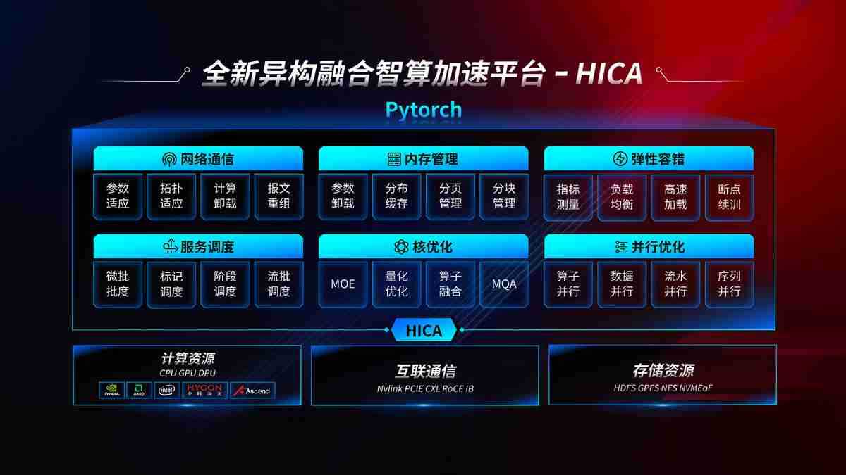通过自研的服务层、、、中间适配层、、、以及调度编排算法,,,,采用数据并行、、、模型并行等多种并行方式,,,把并行计算任务进行有效的分解,,,使其分别由相应的软件栈和算力资源来承接。。。当GPU资源变化,,HICA可以实时动态调度计算子任务并调整模型拓扑和架构,,,以充分聚合各种算力资源。。。。