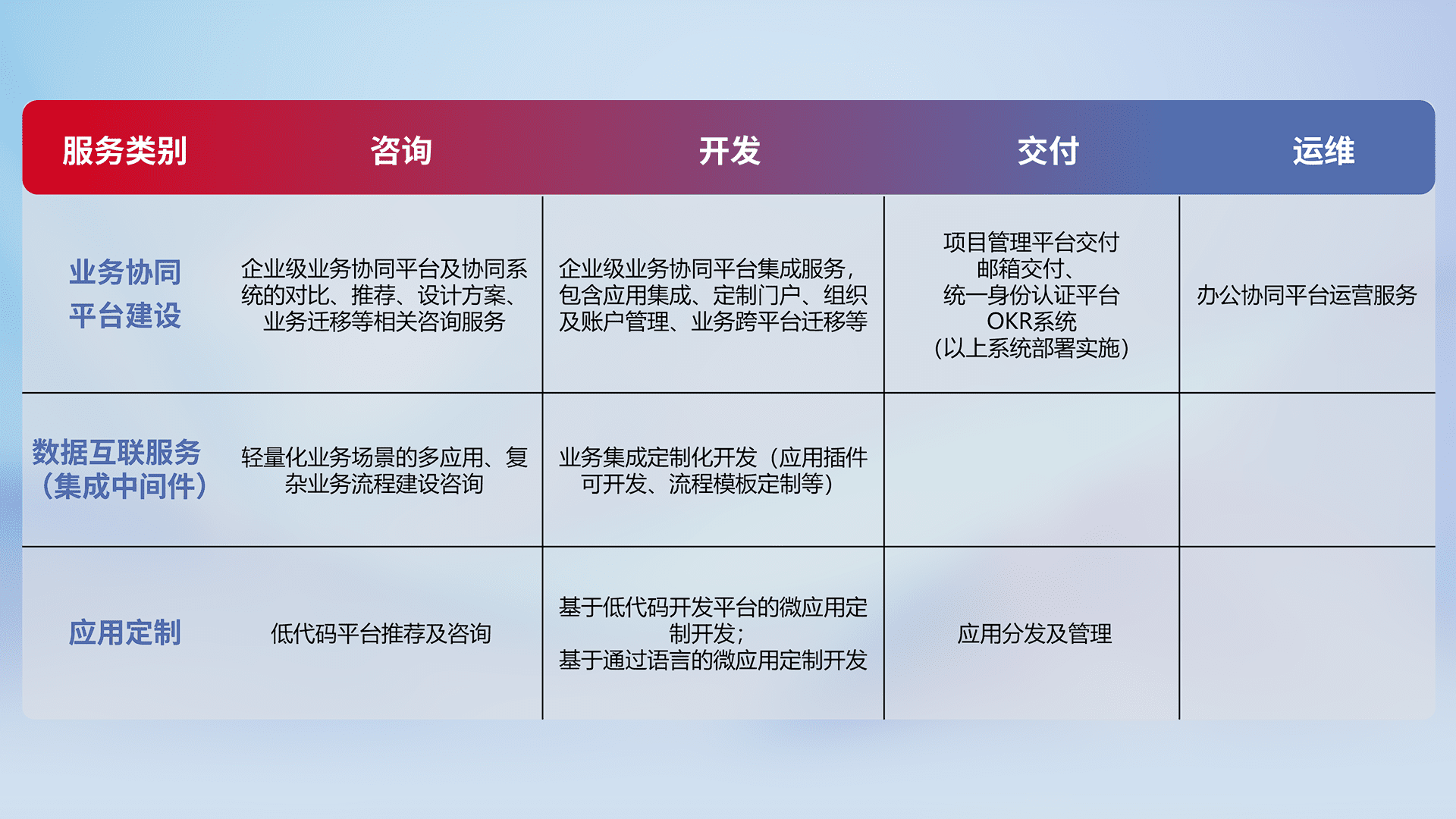 针对钉钉、、、、企微、、IDaas等平台级产品提供产品的规划、、、方案、、、、交付、、定制化开发等服务,,,实现如统一协同办公、、、、智能客户服务、、、、混合会议管理、、、、智能数据查询、、、等业务场景,,,实现数字化转型。。。。
